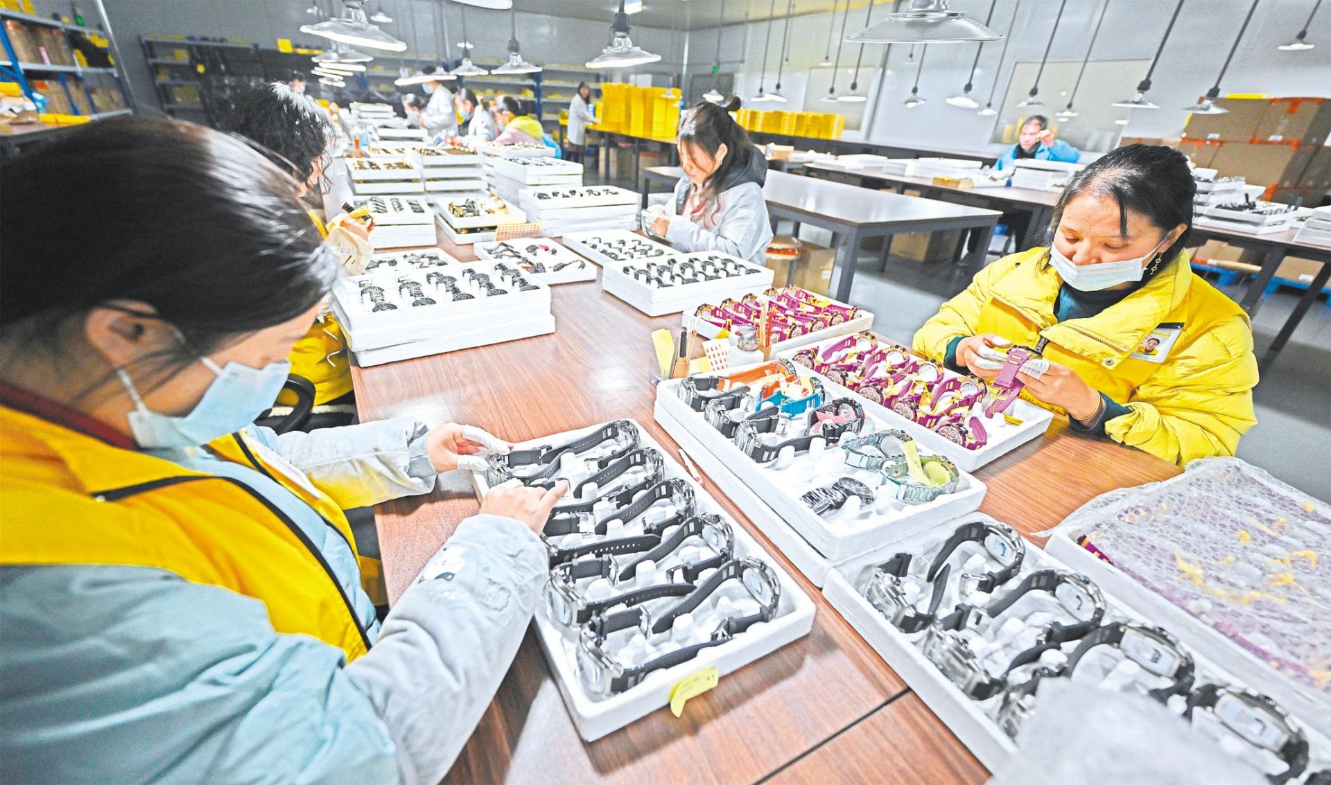 1月5日,公安县湖北兆盈嘉泰精密科技有限公司员工正在专心装配款式新颖的出口手表。这家生产时尚运动款手表及智能穿戴产品的公司位于公安县青吉工业园。去年,该公司出口成品230万只,出口额5.3亿元,今年计划追加投资,建设钟表博物馆,推广本土文化品牌“三袁”和“雷蒂安”,打造一流的手表品牌。(湖北日报全媒记者 刘曙松 通讯员 王文初 摄)