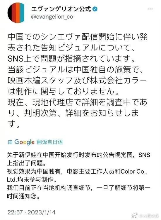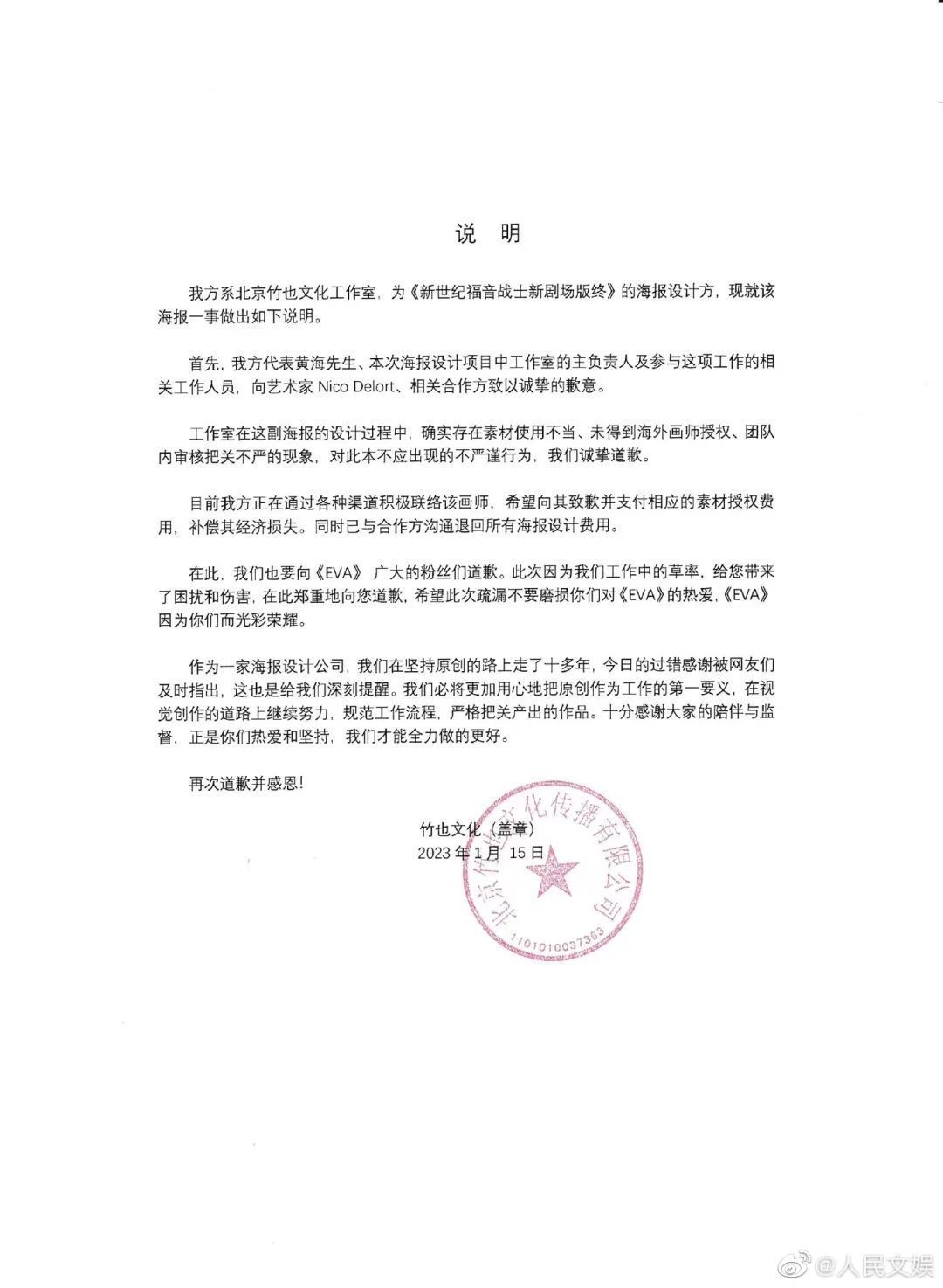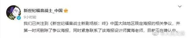 原作者Nico Delort表示并未对此授权。新福音战士官方第一时间也已删除争议海报。