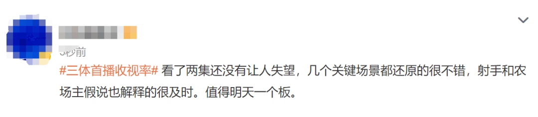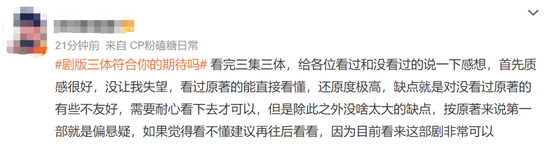 “三体第一集不错,忠于原著,难得。但是好像有点过于忠于原著了,不好说,继续观望。”微博用户@江宁婆婆写道。