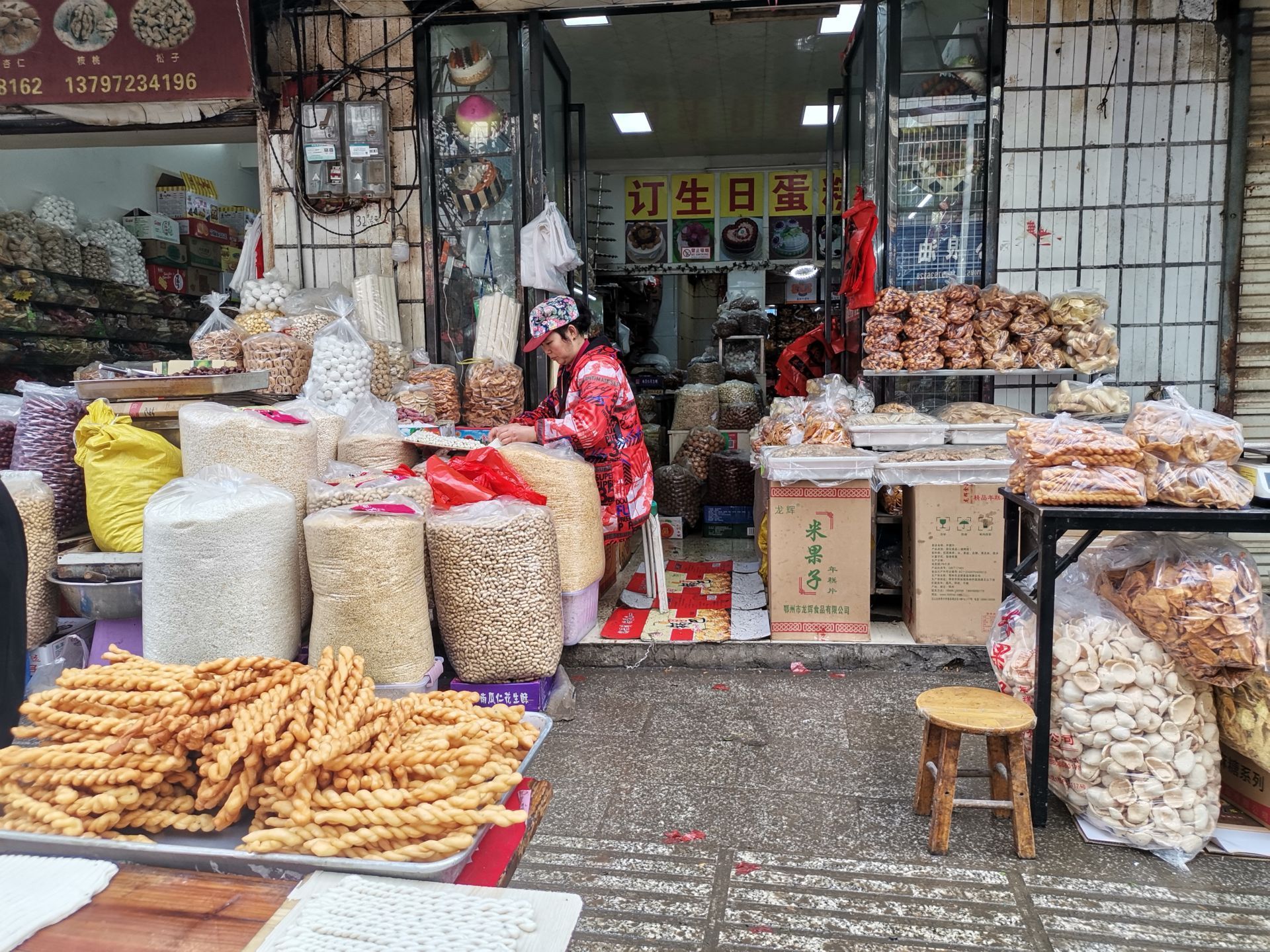 在油炸干炒一条街,现炸的花饺、麻花香气扑鼻,花生、瓜籽、吊瓜籽、蚕豆、板栗等各种炒货齐全。在家佳蛋糕店,除了定制蛋糕,二十多种炒货从里屋一字摆出,撩动人的味蕾,很想都尝上一口。