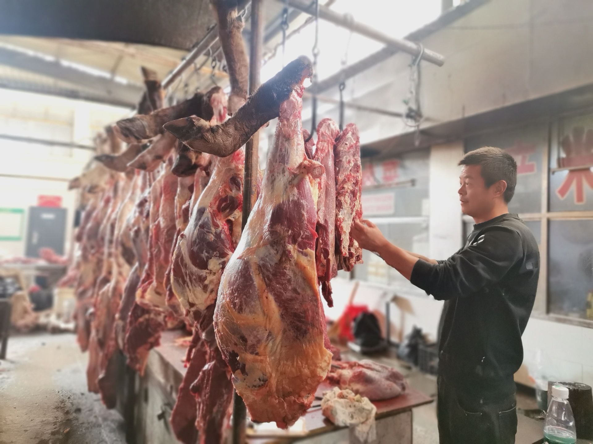 在集贸市场,牛肉排排挂,猪肉摆上案。在客户的要求下,排骨2斤,猪脚3斤,前夹肉5斤,老板郑荣信手起刀落,剁下的肉过称时分毫不差。“年关将近,一天可卖掉6只猪肉,毛收入万余元。"郑荣信笑道,曾是镇食品公司职工,改制后干起卖猪肉老本行,生意还不错。另一边小钟牛肉生意也十分红火。老板钟水笑道:“一年就这半月生意最火,每天可销2头牛呢。”