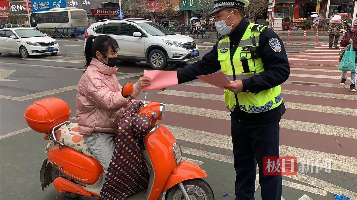 “爹爹,您骑摩托车出行记得佩戴安全头盔,马上要过年了安全第一。”1月14日清晨,在湖北省鄂州市临空经济区燕矶镇一路口,看到市民王爹爹没有佩戴安全头盔,鄂州市公安局交管局临空大队民警随即上前提醒。据介绍,为护航平安春运,1月14日,鄂州市公安局交管局启动安全宣传行动,构建安全的交通出行环境。