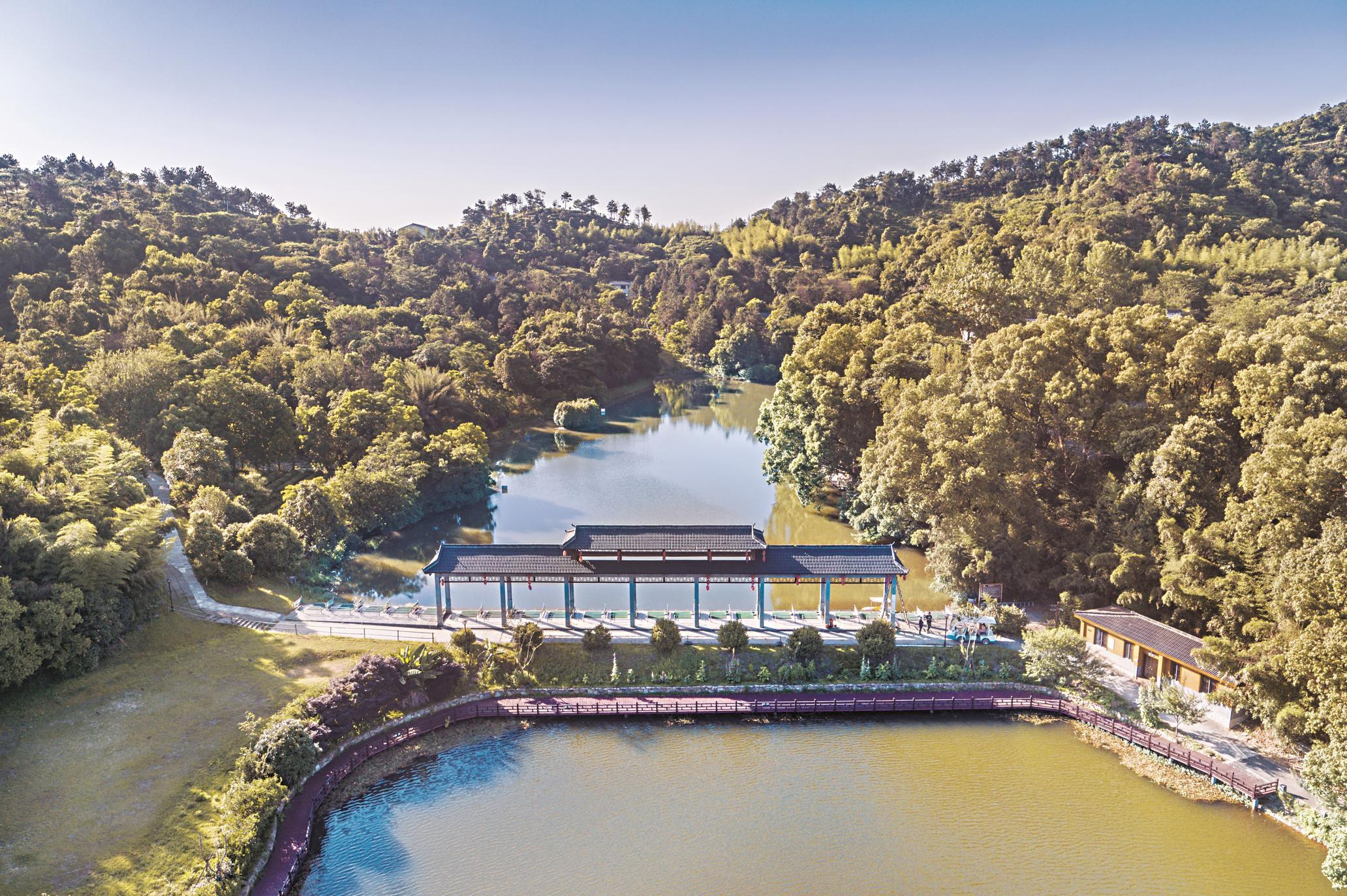 从市中心驱车一小时,就能到达木兰湖畔的青荷·小木,全湖景露台房配备高品质家居设施,极简的轻奢装修风格与天然湖景相依相融,让都市游客近郊也能“看海”。坐在樾和林泉的小院,冬日阳光从遮天蔽日的林木缝隙里照到脸上,一瞬间暖流漫溢全身。