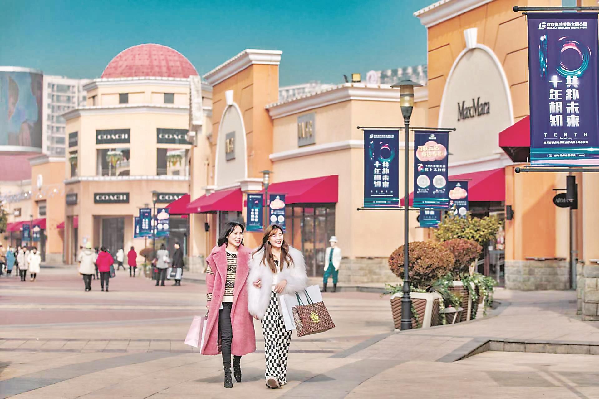 百联奥特莱斯广场里客流络绎不绝,市民游客结伴出行,拎着大大小小的购物袋开心“扫店”。