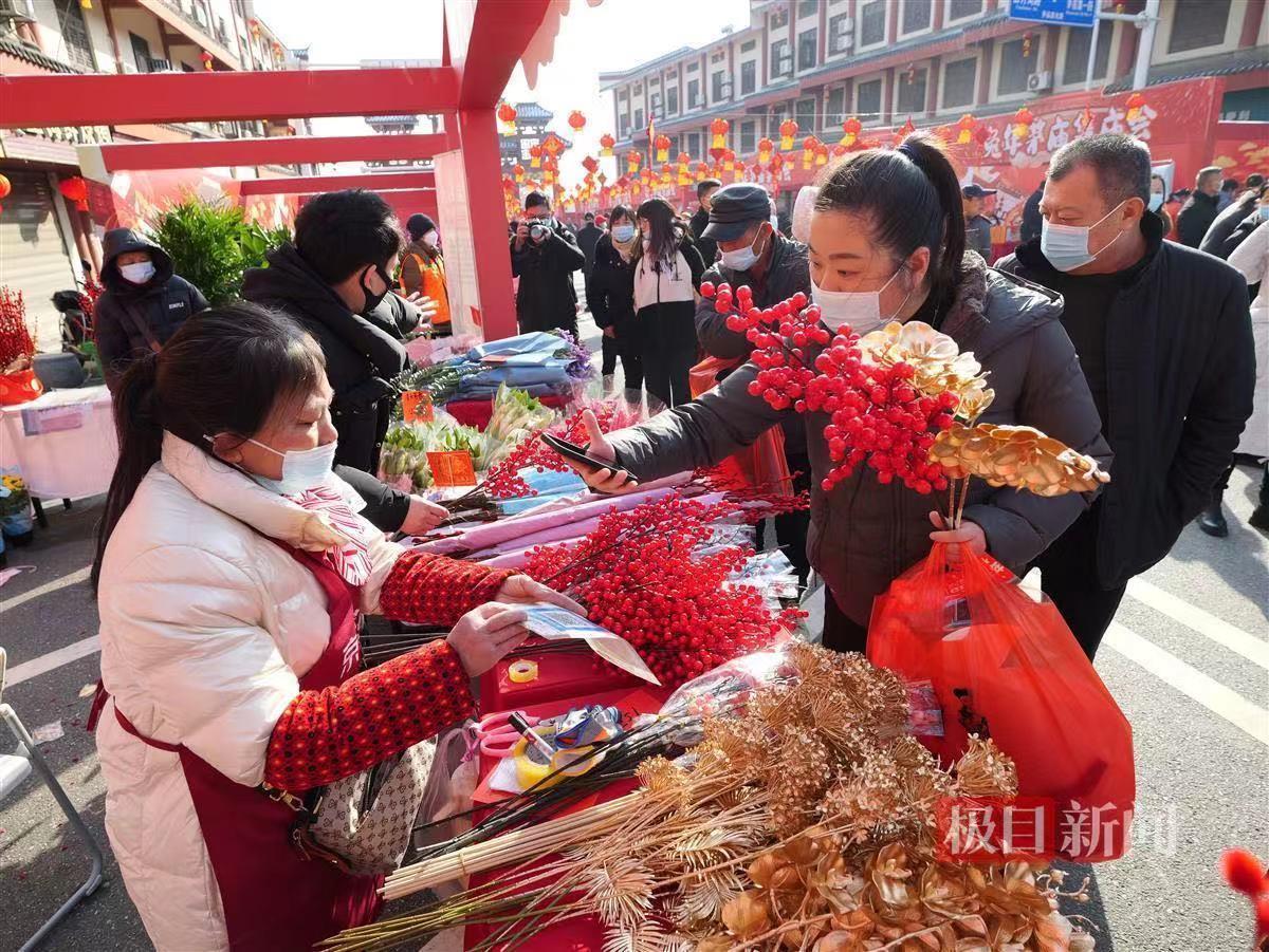 刚步入集市,可见花卉摊位铺成“花路”,沿路摆放着各类花卉,供市民朋友观赏、挑选。长寿花、仙客来、红如意、火炬等颜色红火的盆栽错落有致地摆出,一些盆栽上点缀着过年的“福”字或灯笼装饰,颇有一番趣味。一位花卉摊位负责人舒先生告诉极目新闻记者,他们特意选择了名字吉祥、造型喜庆且好养活的植物来到庙会进行展卖,盆栽包装也换成了红袋子、福字红色花盆,希望能给游客们带来新年鸿运。