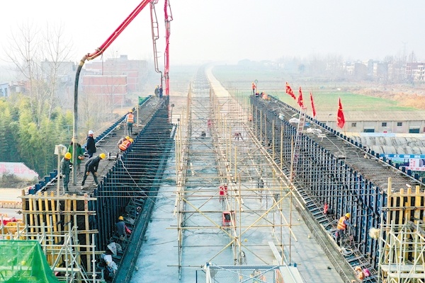 1月12日凌晨,随着最后一方混凝土浇筑完毕,沿江高铁天门段跨S213省道槽型梁顺利浇筑完成。