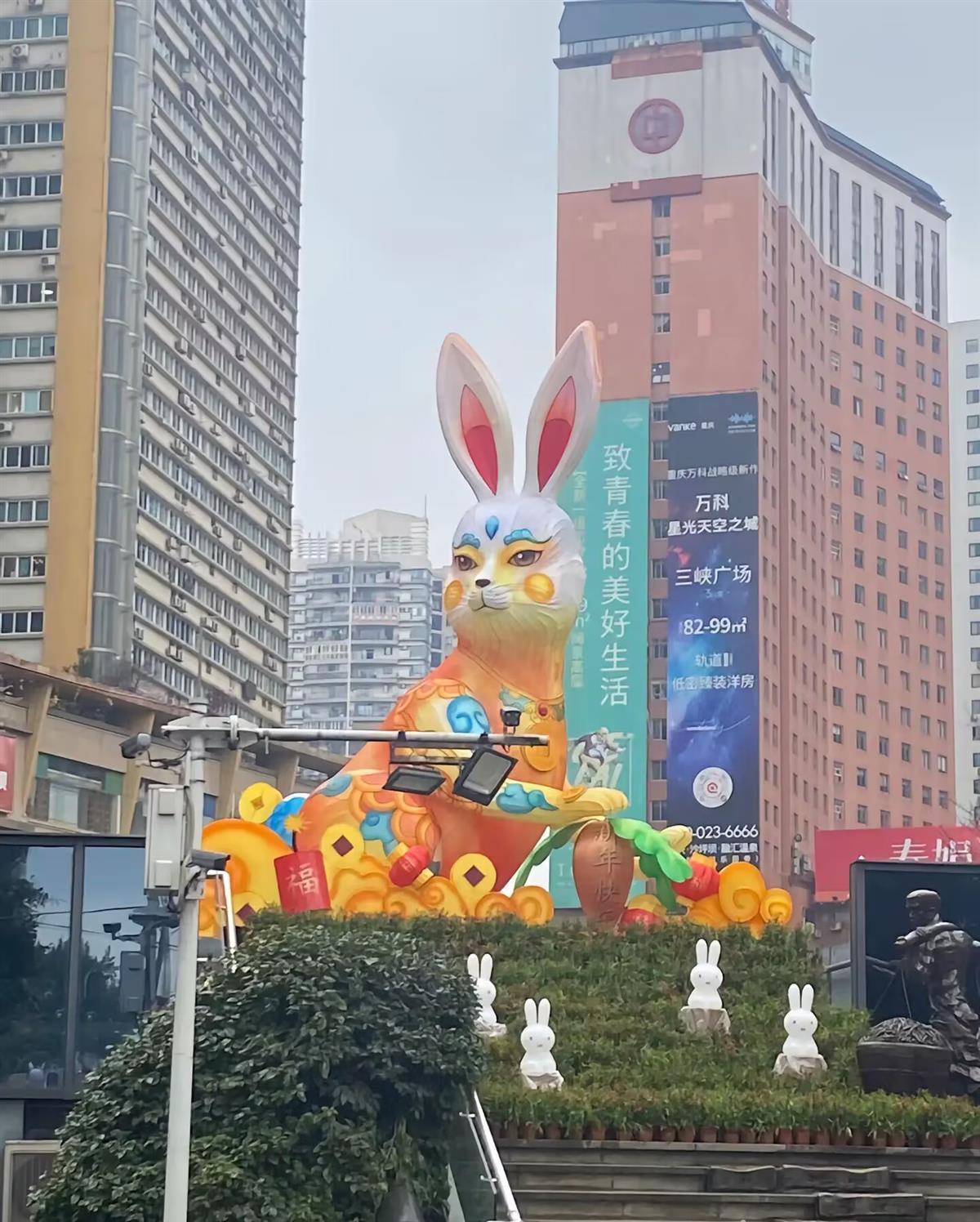 重庆沙坪坝区三峡广场是沙坪坝区的核心商圈之一,而近期该广场上一巨型兔子灯饰被频频吐槽,有网友认为该灯饰“兔子不像兔子,猫不像猫”;还有网友觉得“丑萌丑萌的”;当然也有网友认为,这只是一个年味装饰,能起到装点作用即可。
