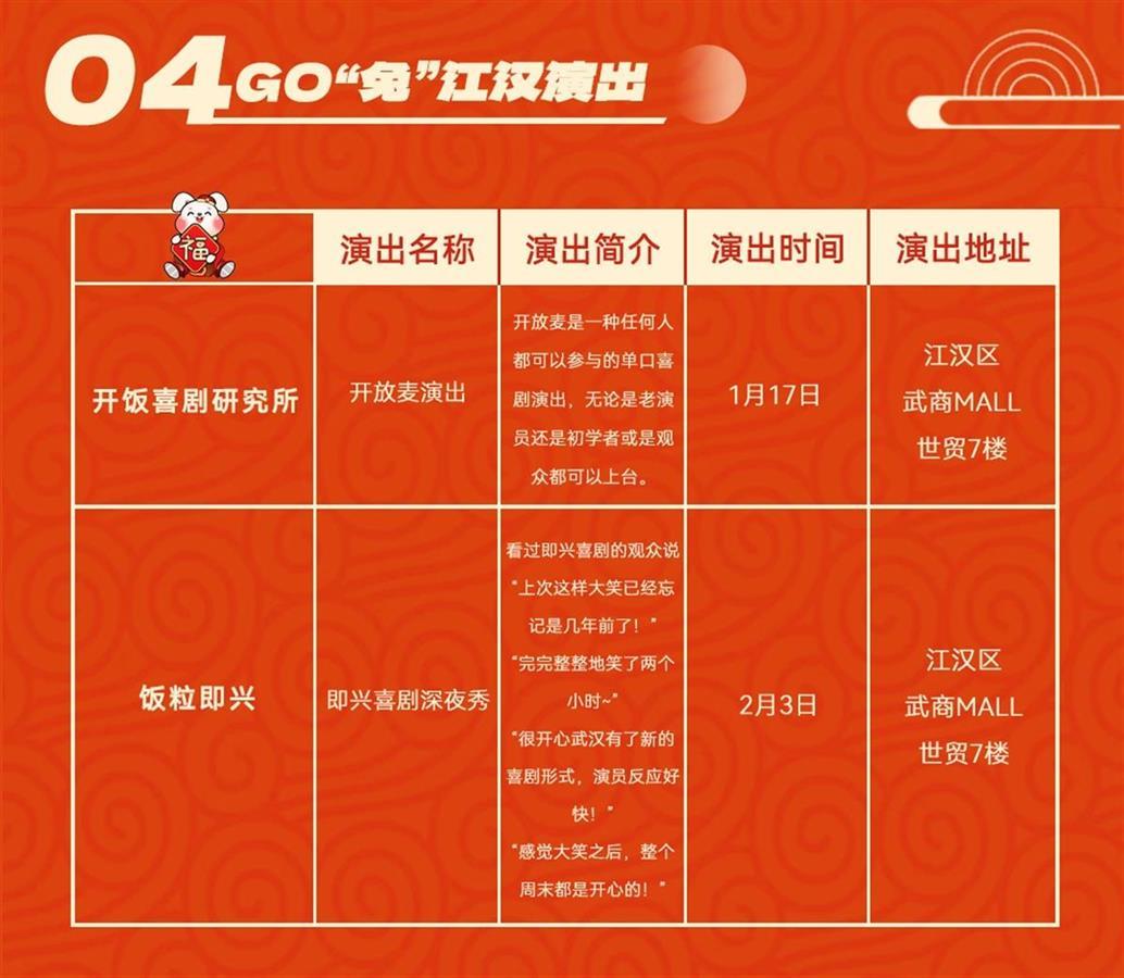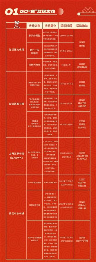 湖北日报讯(记者张倩倩 通讯员朱素芳 翟好斌)春节临近,武汉市江汉区依托辖区内文化馆、图书馆、书店书城、商业街等场所,已备好一道道丰盛的“文化大餐”。其中既有带着浓厚传统年味的观楚剧、品年俗、赏非遗等活动,还有剪纸展、剧本杀、脱口秀等潮流文化活动。系列活动最早2022年12月已开启,最晚将持续至3月,江汉区邀请市民一同感受幸福年味、体验民俗文化、追寻城市记忆。