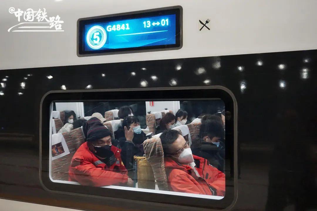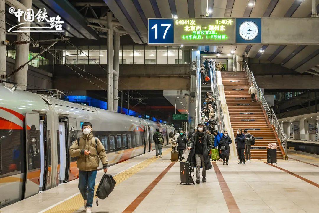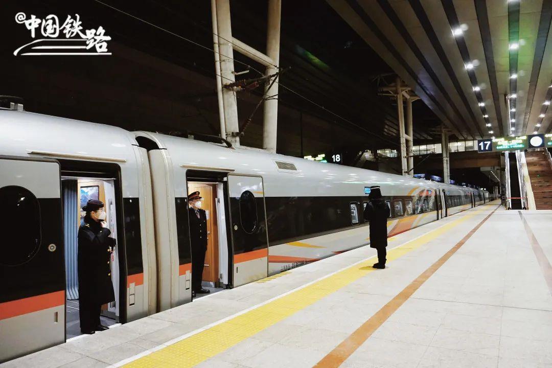 1月17日凌晨,北京西站开行去往武汉、郑州等方向的首趟夜间高铁,护送旅客回家过年。