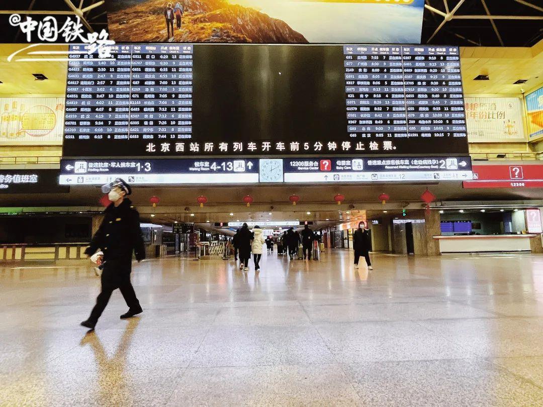 北京西站持续做好全天候服务工作,密切关注客流变化,安检、保洁、铁警等值班人员24小时在岗,做好旅客乘降安全引导服务工作。