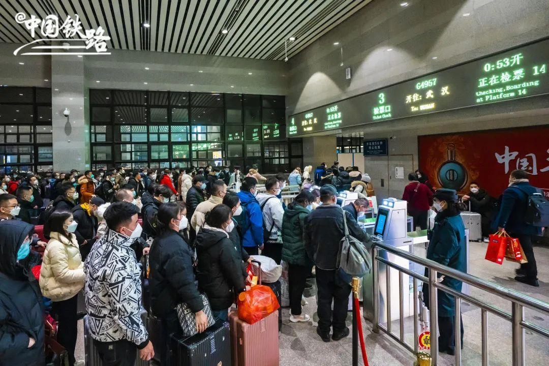 零时23分,“正在检票”的字样出现在3、4检票口的显示屏上,北京西至武汉的首趟夜间高铁G4957次列车开始检票。旅客们拉着大大小小的行李、拎着五颜六色的年货,有序地排队乘车,踏上返乡的旅途,期待着与亲人久违的拥抱。