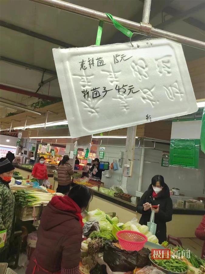 据该网友发帖称,1月18日上午,其到位于硚口区古田三路的古乐市场买菜,询问蒜苗价格后“吓得一跳”:“新鲜蒜苗一斤高达45元,是我昨天买五花肉价格的3倍。”该网友问了几个经营户,得知:“进价太高,我们每人进了5把,今天开市两个多小时,一根都没有卖出去。”最后,该网友买了半斤老蒜苗,付款7.5元。