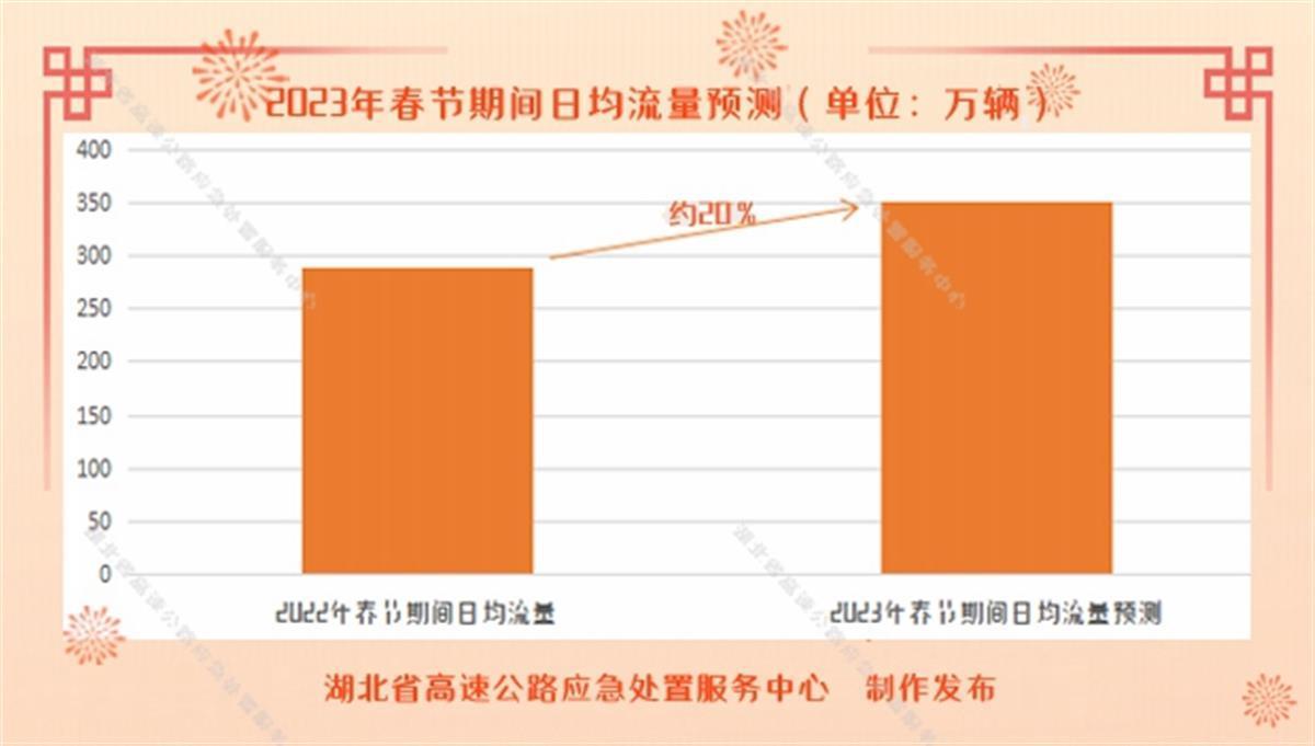 预计2023年春节期间,湖北高速公路路网流量将呈现前低后高的趋势,主要以探亲出行为主,日均流量较平日将大幅增长。预计1月21日、22日(除夕、初一),全省路网车流量跌至谷底。1月23日(初二)路网流量逐渐回升。1月26日和27日(初五、初六)预计有密集返程车流,形成春运第一波返程高峰。预计2023年春节期间高速公路日均出入口流量较2022年同期增长约20%。