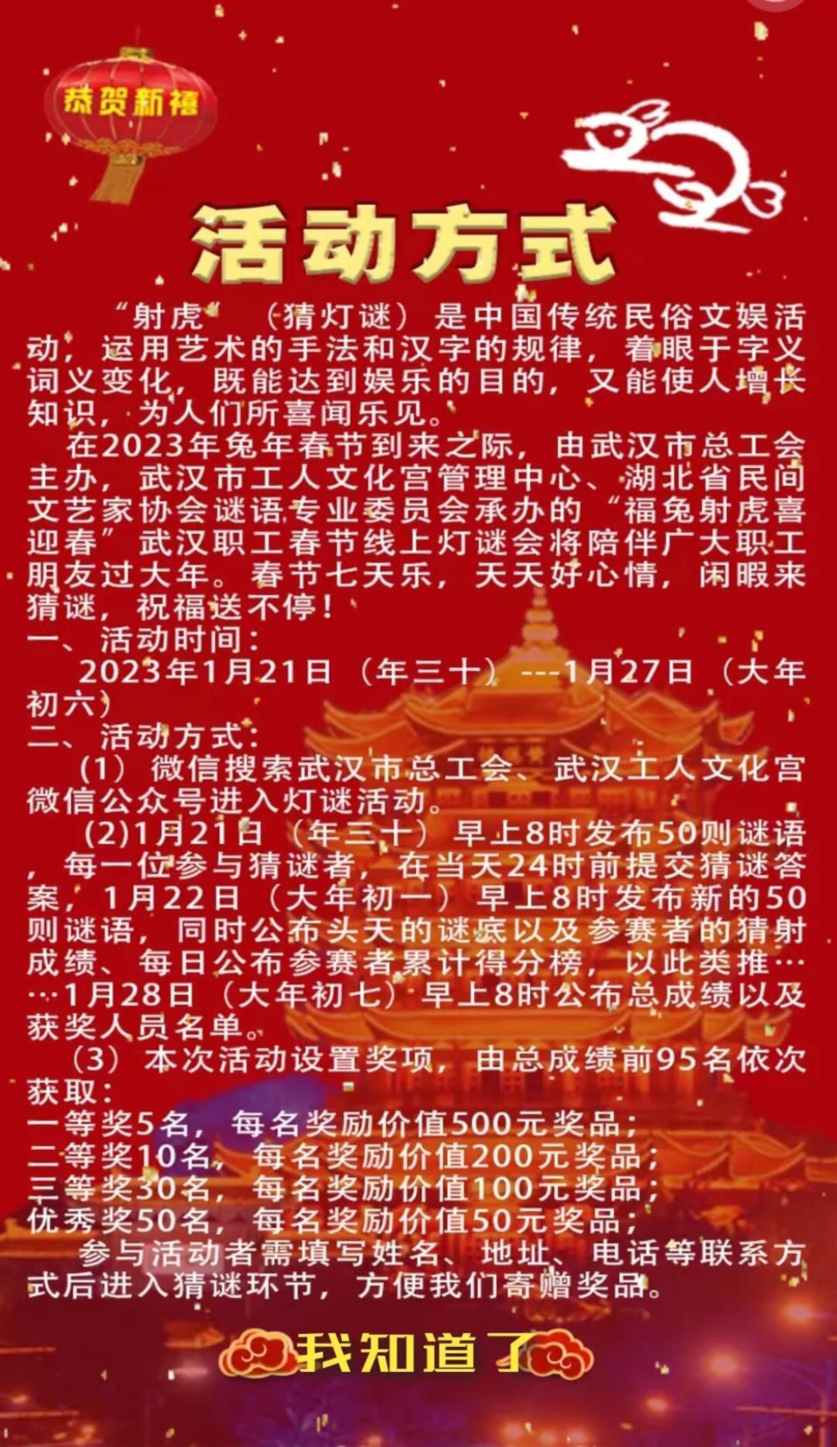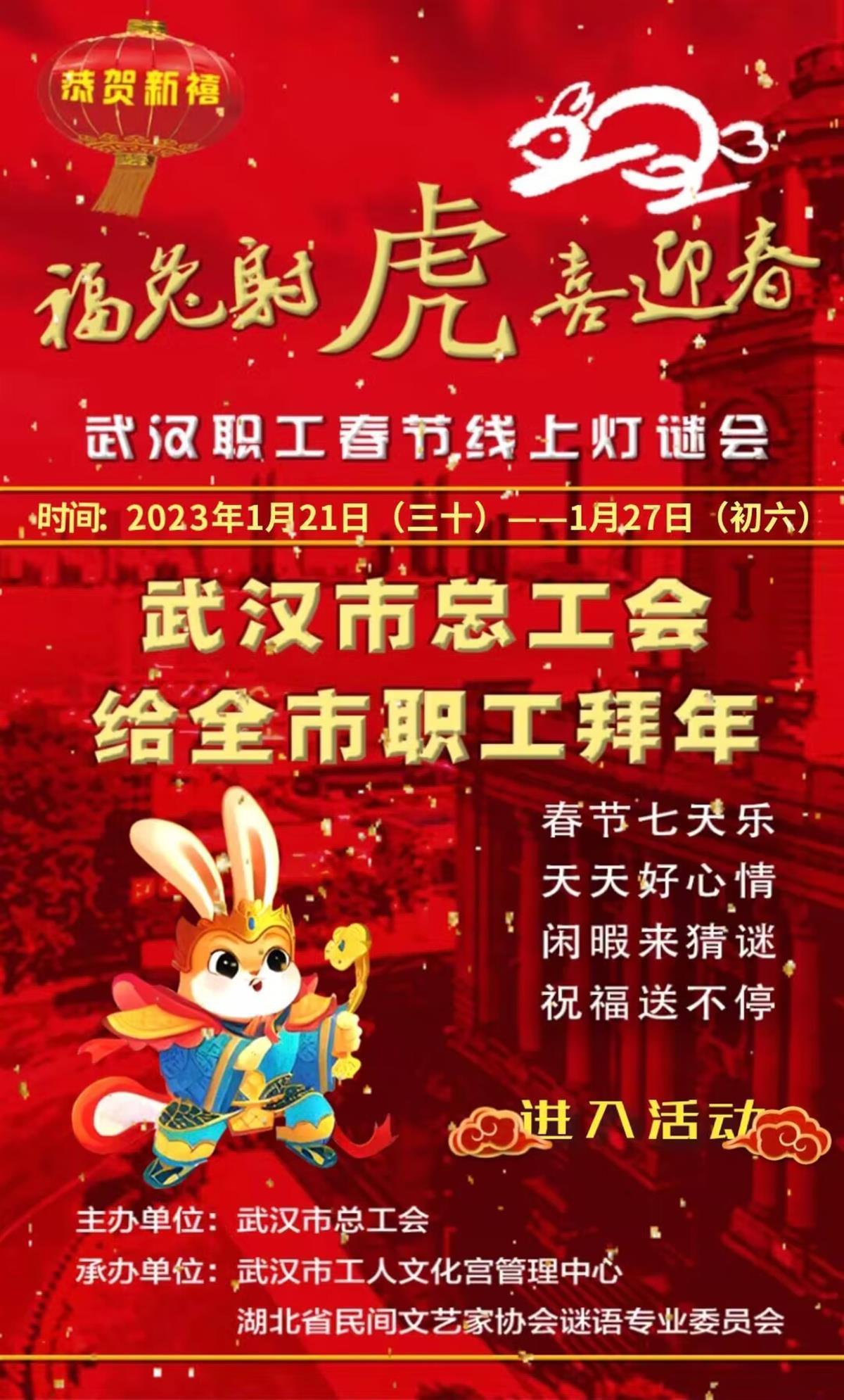 春节七天乐,天天好心情,闲暇来猜谜,祝福送不停!从大年三十到正月初六,武汉市总工会为弘扬传统文化,丰富职工春节文化生活,主办了“福兔射虎喜迎春”武汉职工春节线上灯谜会。