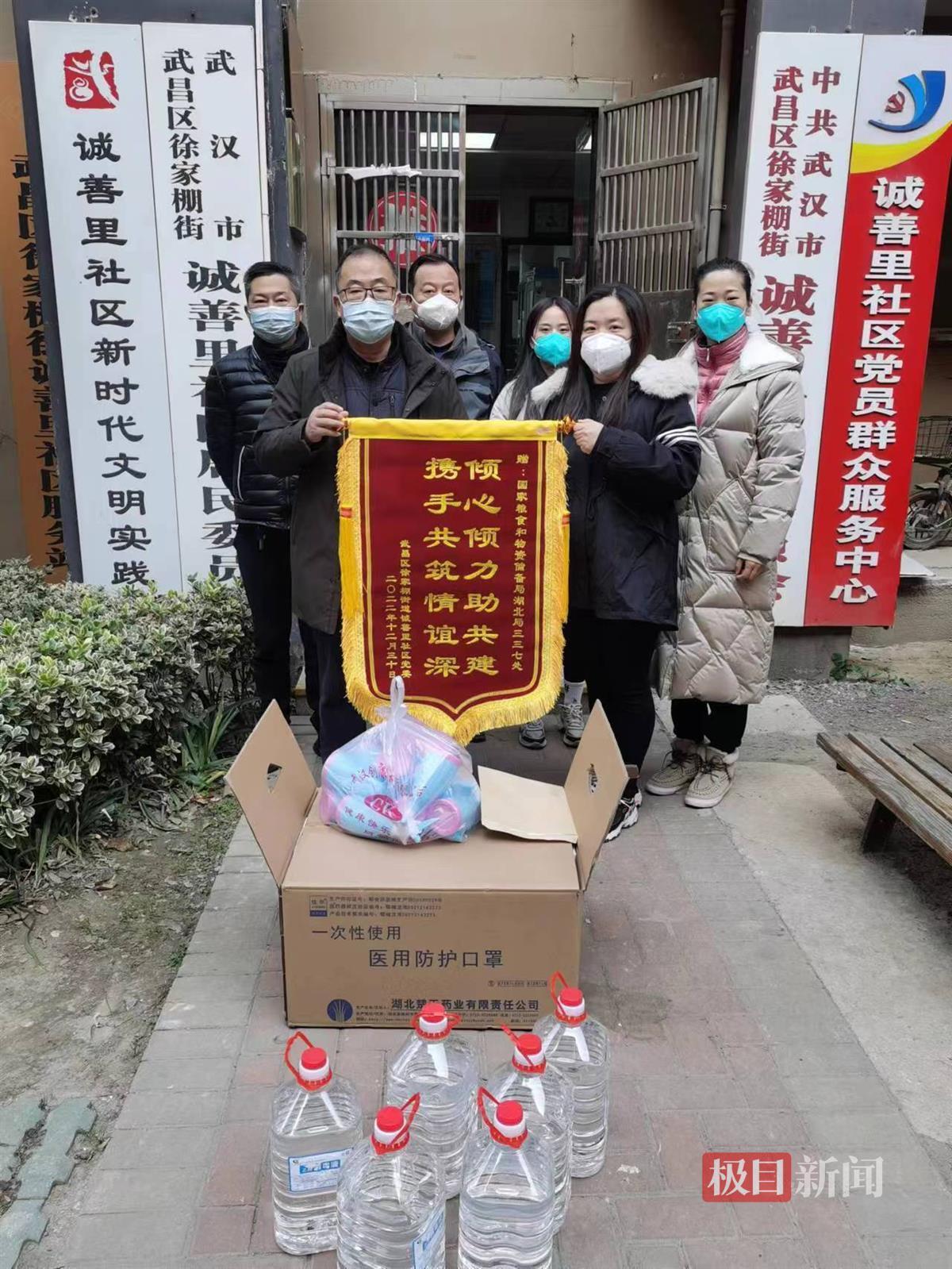 年关将近,武汉市徐家棚街道诚善里社区与共建单位国家粮食和物资储备局湖北局三三七处根据居民需求,共同为独居老人、残疾人等“五类人员”提供暖心服务,为他们送去口罩、消毒酒精、水杯等暖心礼物。