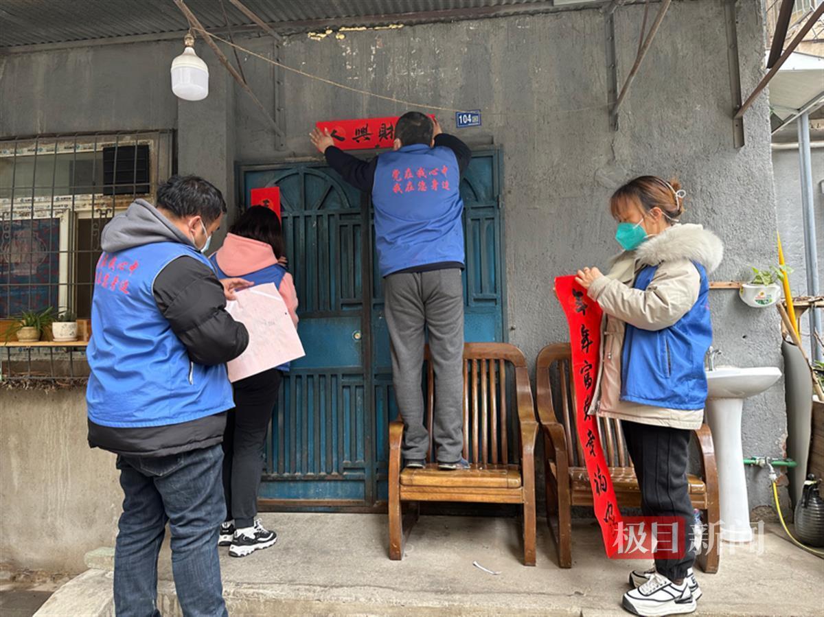 除了美味的团年饭,社区网格长们亲手为居民写对联。把春联写好后,网格长们把新春祝福送到居民家里。张爹爹今年儿子在外地回不来,一个人在家过年。网格长张启芳听说了此事后,找到了同为社区网格长的高巍、殷珺、傅文斌商量,亲手为张爹爹写一副招财进宝的对联,并且亲手贴上。