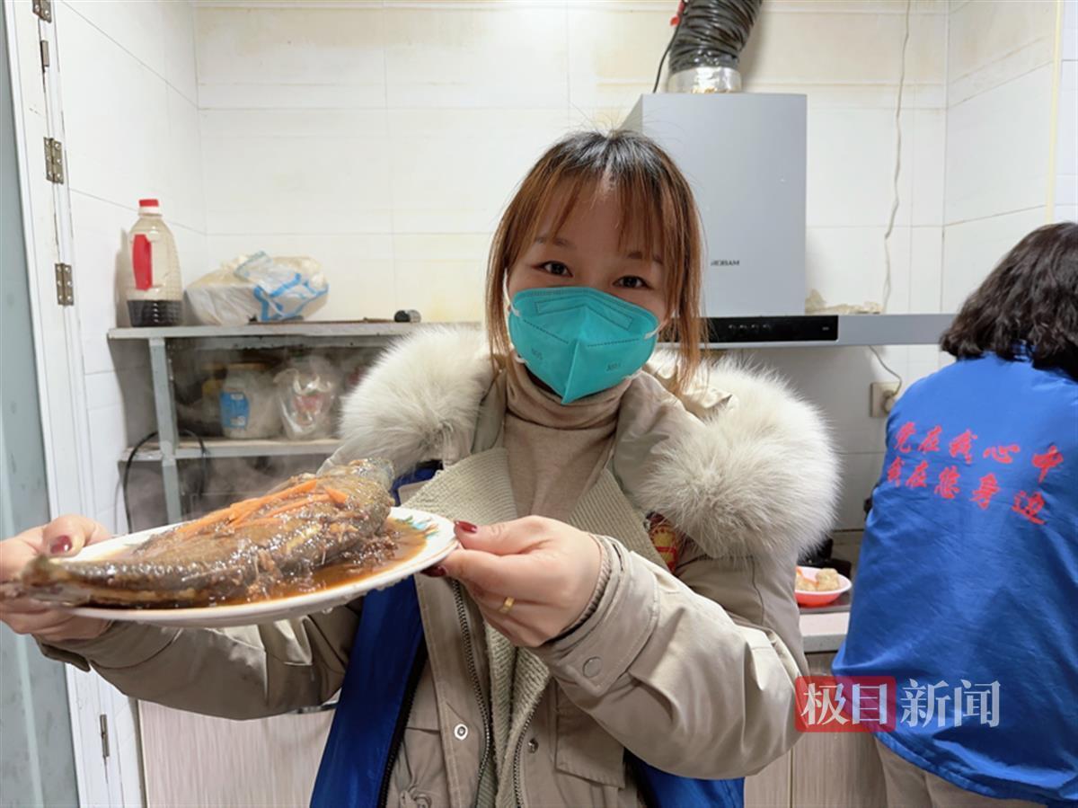 网格长张启芳正在将做好的鳊鱼端上餐桌