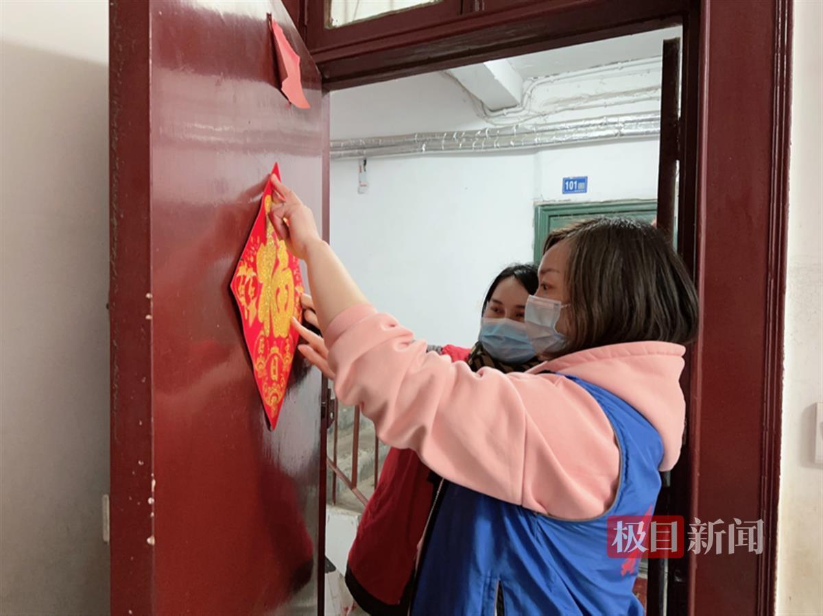 副书记赵丹和网格长殷珺帮刘婆婆家的门上贴福字