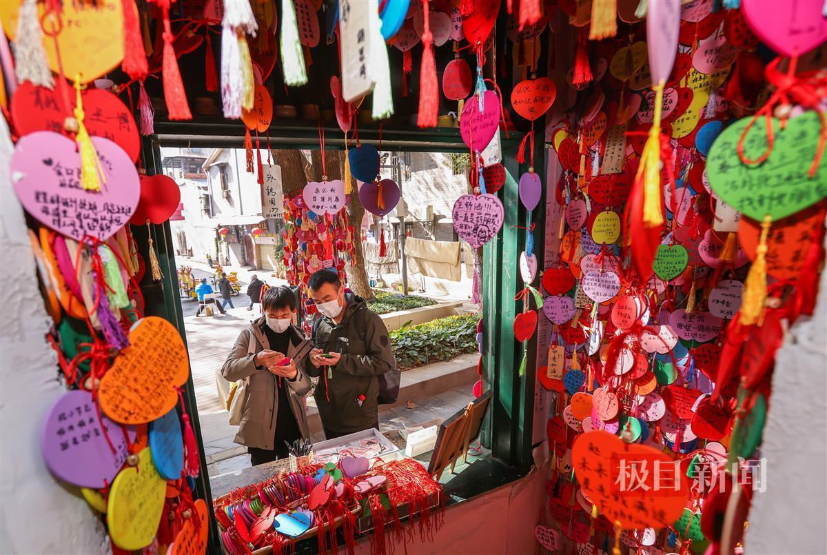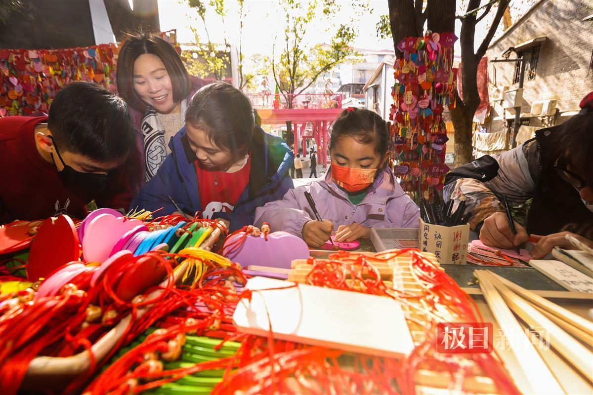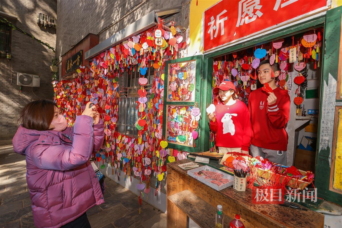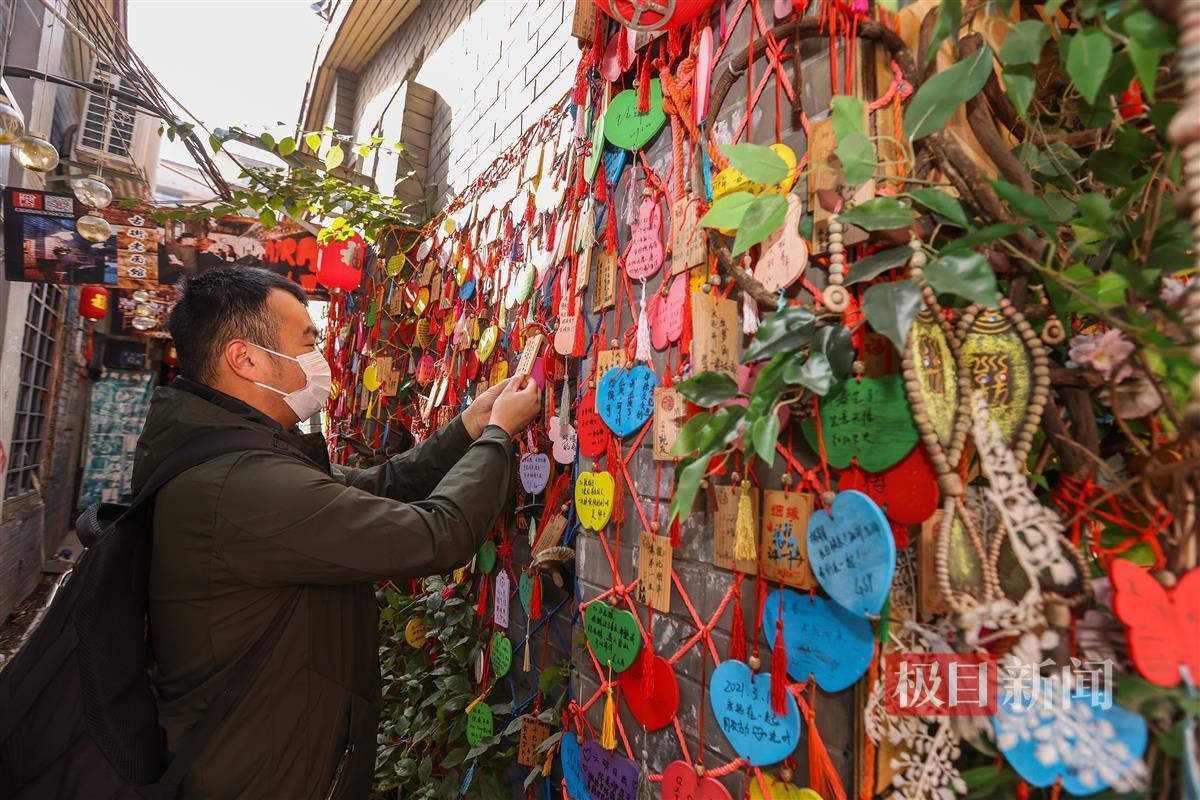 1月20日, 春节临近,街头巷尾的节日气氛愈加浓厚。在武昌昙华林“祈愿屋”前,数以万计各种形状,五颜六色许愿牌挂满了两面墙,不少游客在许愿牌上写下美好的新年祝福,挂在祈愿墙上,表达对来年的期盼,祈福在新的一年吉祥如意、心想事成!