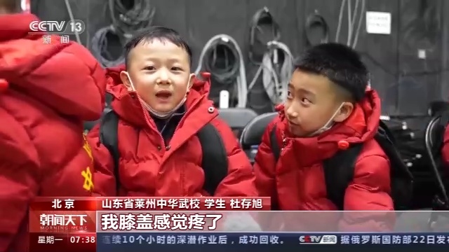 山东省莱州中华武校学生 杜存旭:我不小心失误了好几次了,然后我往上一跳的时候,我膝盖感觉疼了,然后我还在那里练。练着练着破皮了,但是我们教练说不能放弃。