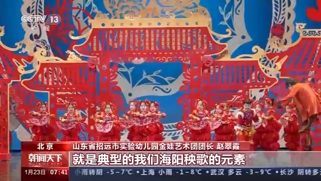 配合舞龙、滚球,踩高跷,导演组还将具有山东民俗特点的剪纸、花饽饽、海阳秧歌等非遗元素融入节目。来自山东招远实验幼儿园的小朋友们,成为踩着高跷扭秧歌的小演员。