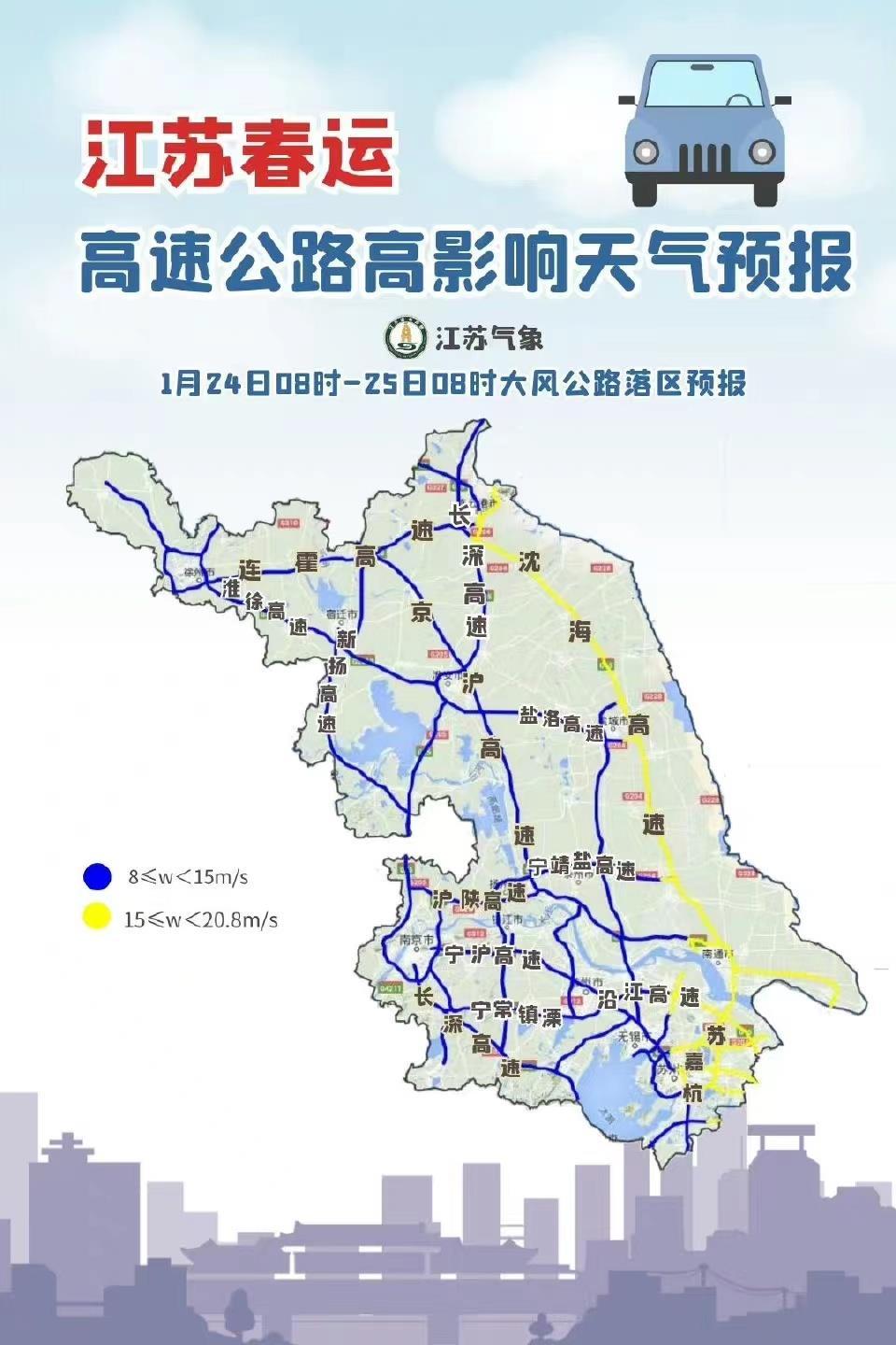 1月24日08时至1月25日08时,受冷空气影响,江苏全省风力增大,大部分地区将出现陆上5~7级、江河湖海面9级左右的偏北大风,其中东部高速、苏通大桥、扬子大桥、宁靖盐、宁通东段、沿江、苏嘉杭、沪苏浙等路段阵风风速可达7~8级左右。
