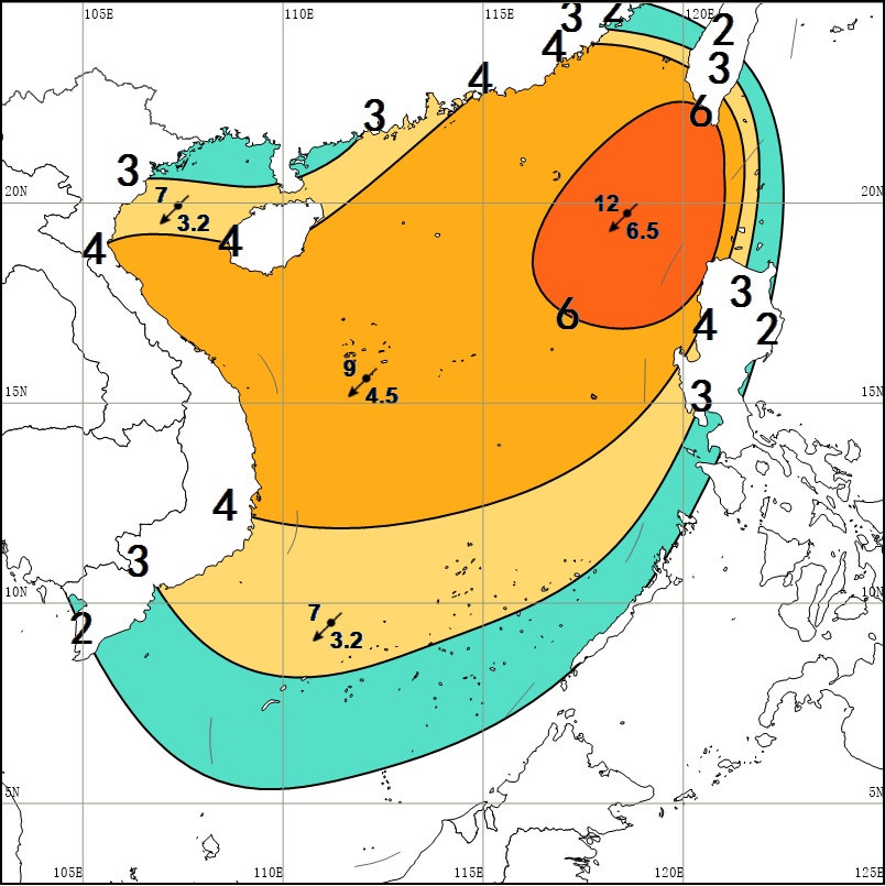 海南岛东部、南部近岸海域将出现3.0~4.0米的大到巨浪,近岸海域海浪预警级别为黄色。