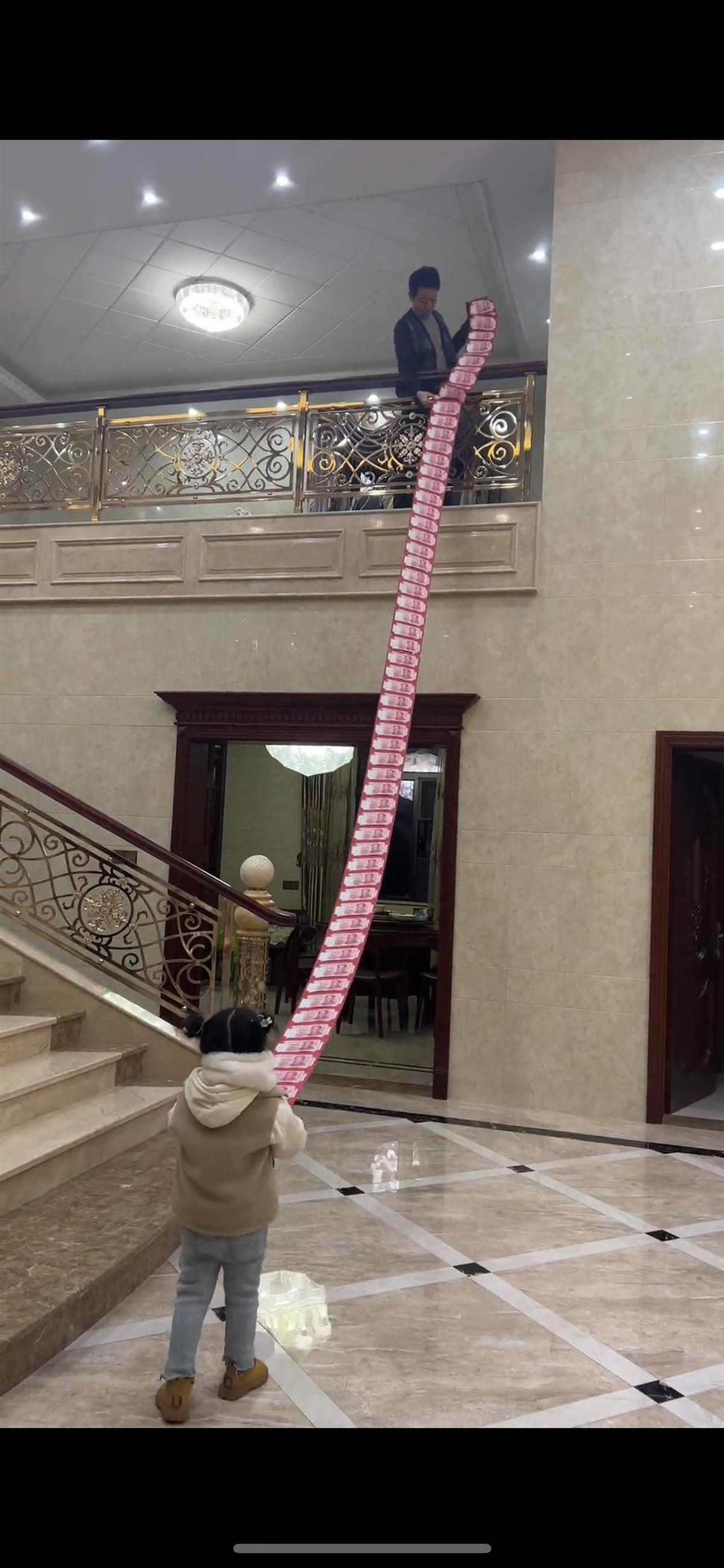1月24日,吴女士向记者介绍,他们一家是福建福清人,平日在外做生意,年前回到老家过年。除夕当天,一家人吃完年夜饭后,爷爷便拿出提前准备好的“超长”红包给孙女,因为红包约有13米长,爷爷便站到二楼,从二楼往下发红包,过年的仪式感拉满。