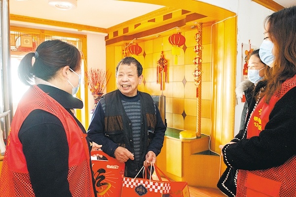 1月19日,春节前夕,在武汉市青山区钢都花园街道125社区,社区“天天敲门组”成员上门为辖区残疾群众、退役军人、高龄独居老人、困难党员等群体送上新春慰问和年货物资。 (湖北日报全媒记者 何宇欣 通讯员 张湘英 钟歆 摄)