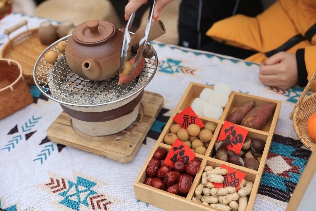 红彤彤的木炭火,烤热乎的土罐子,慢慢地煨着茶。花生、红枣、板栗······把烤盘填的满满当当,在这清浅的时光里,一手烟火一手诗意,皆是人间浪漫。