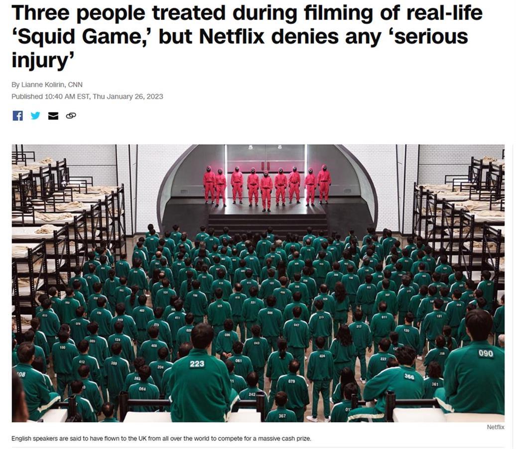 据CNN报道,当地时间1月26日,美国流媒体巨头网飞(Netflix)证实,有三人在拍摄《鱿鱼游戏》真人秀节目期间接受治疗,但否认有人受到“严重的伤害”。