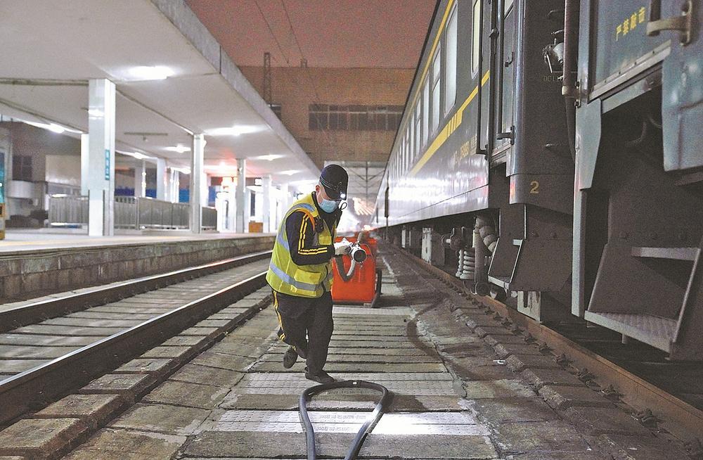 1月21日,农历除夕,襄阳火车站股道里,上水员正在紧张作业。春节期间,该站客运车间上水吸污工每天在股道里往返步行近10公里,为南来北往的旅客列车上水吸污。为不影响列车正点开行,他们每完成一个车厢的上水吸污作业,都要抓紧时间提着吸污管或上水管急匆匆奔向下一个车厢。全媒体首席记者 杨东 通讯员 李涛 摄