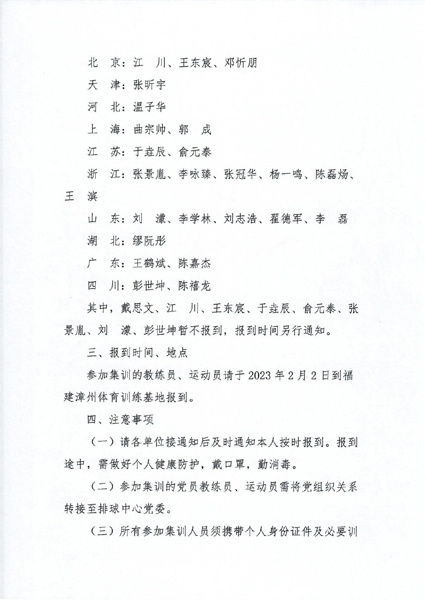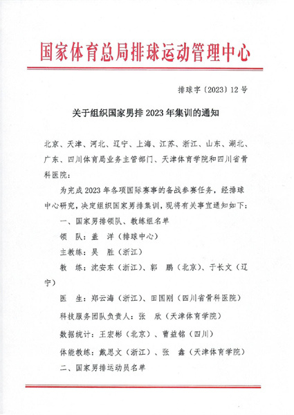 中国男排依然由吴胜担任主教练,共有25名球员入选,其中江川、王东宸、于垚辰、俞元泰、张景胤、刘濛和彭世坤7人暂不参训,其他队员将于2月2日赴福建漳州体育训练基地报到。