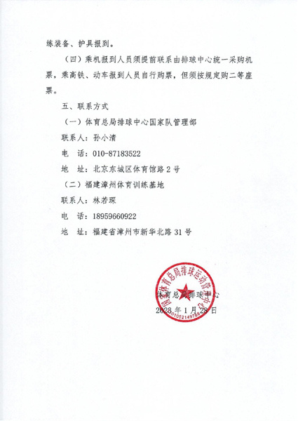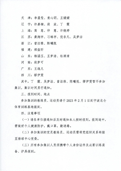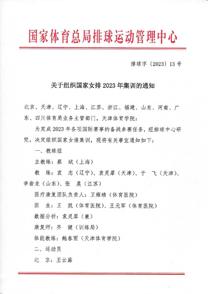 中国女排仍由蔡斌挂帅,共有23名选手入围,其中丁霞、吴梦洁、曾洁雅、陈曦悦和缪伊雯5人暂不参与集训,其他队员将于2月1日赴宁波北仑体育训练基地报到。
