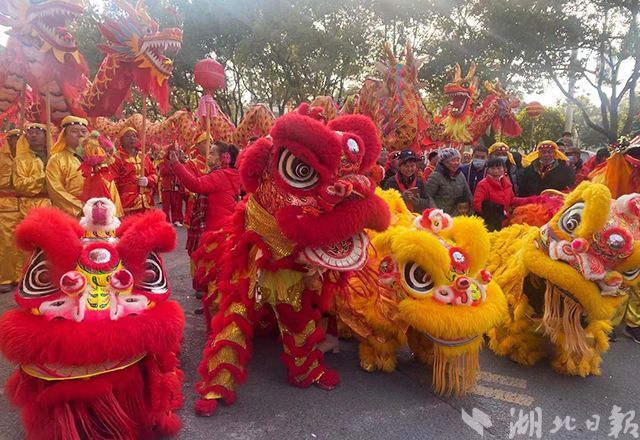 广场上“咚咚咚”的震天锣鼓声响起,伴随着鼓点的快慢轻重,9条长龙时而翻滚穿梭,时而盘旋腾跃;6头威武雄壮的狮子时而卧爬、时而奋跃,好一场集武术杂技为一体的醒狮表演。市民们纷纷摸龙须狮头,或拍照留念,兔年新春图一个好兆头。