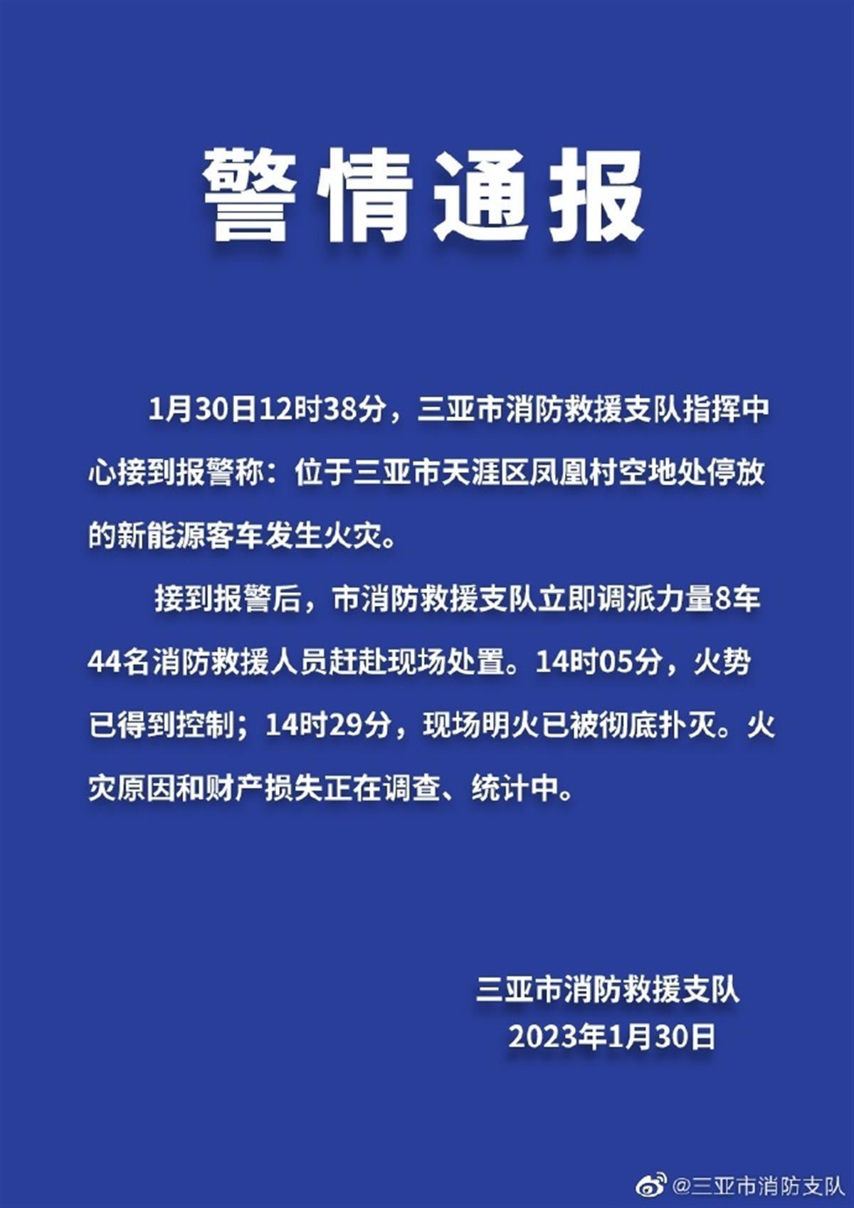 另据三亚市消防支队通报称,30日12时38分,三亚市消防救援支队指挥中心接到报警称:位于三亚市天涯区凤凰村空地处停放的新能源客车发生火灾。支队调派8车44名消防救援人员赶赴现场处置。14时05分,火势已得到控制;14时29分,现场明火已被彻底扑灭。火灾原因和财产损失正在调查、统计中。