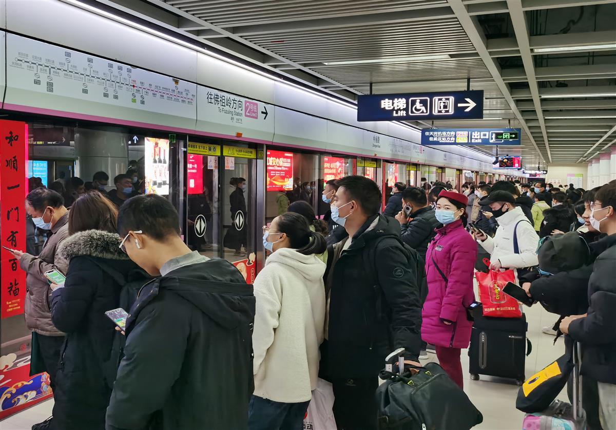 为应对春节返程客流集中现象,交通枢纽重点线路2、4号线的车辆段和停车场,在平常设1列备车的基础上再增1列备车,如遇突发大客流可及时上线投入运营。