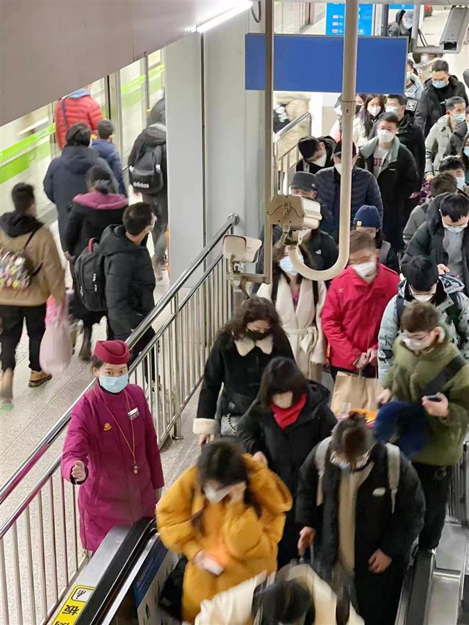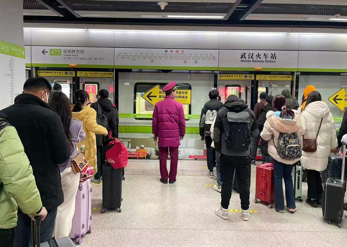 1月31日早高峰时段,武汉地铁2、4号线换乘站中南路站值班站长廖汝琴带领十余名员工热情引导,乘客们安检、进站、候车秩序井然。