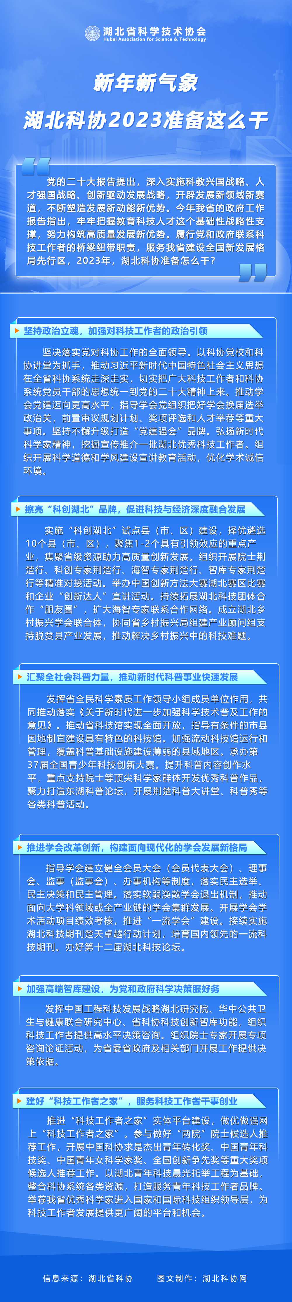 湖北日报讯(记者陈熹、通讯员雷鸣)遴选10个县(市、区),聚焦1-2个具有引领效应的重点产业,集聚资源,助力高质量创新发展;开展院士荆楚行、海智专家荆楚行等活动……1月31日从省科协获悉,新年伊始,湖北省科协下发2023年工作重点,认真履行党和政府联系科技工作者的桥梁纽带职责,服务湖北建设全国新发展格局先行区。