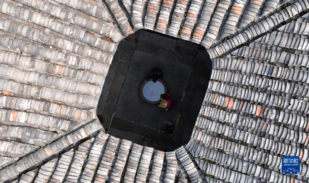 这是2月1日在旧州古镇拍摄的一户四合院的天井(无人机照片)。