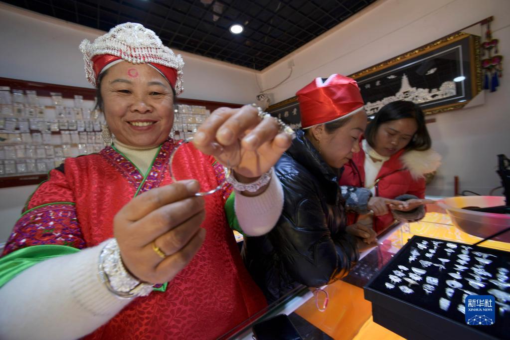 2月1日,游客在旧州古镇一家银饰店选购银饰。