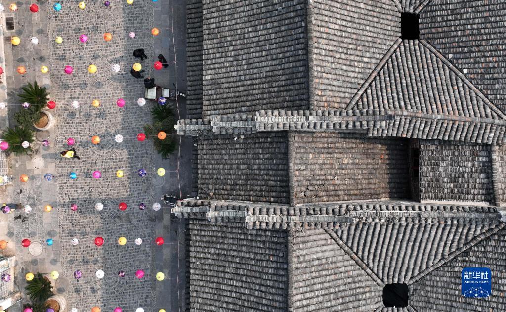 这是2月1日拍摄的旧州古镇一角(无人机照片)。
