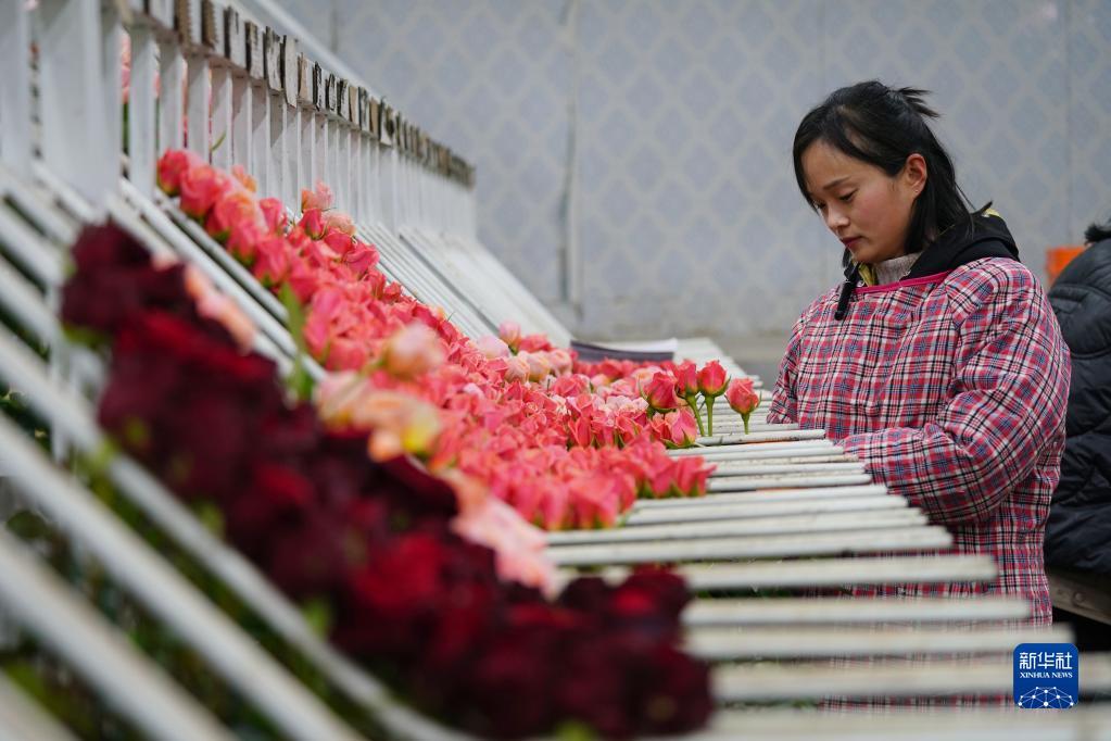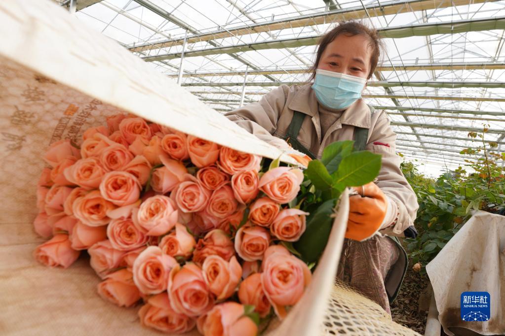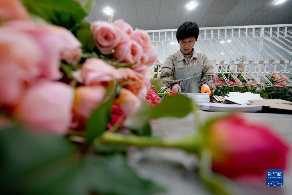 2月1日,村民在河北邱县盛水湾玫瑰产业园包装玫瑰花。