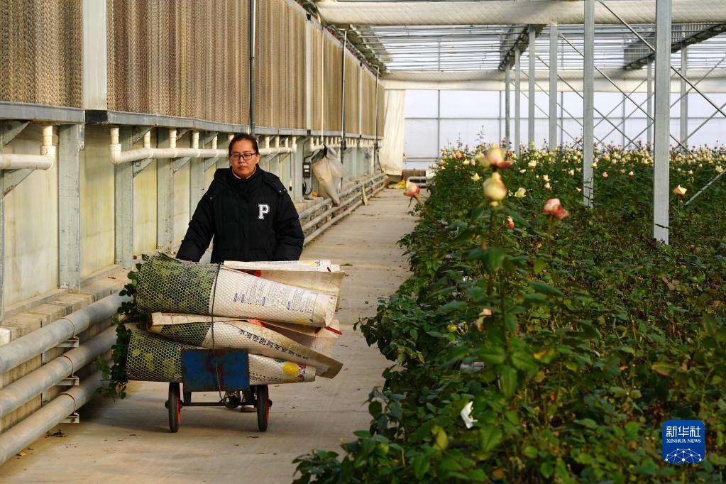 2月1日,村民在河北邱县盛水湾玫瑰产业园采收玫瑰花。