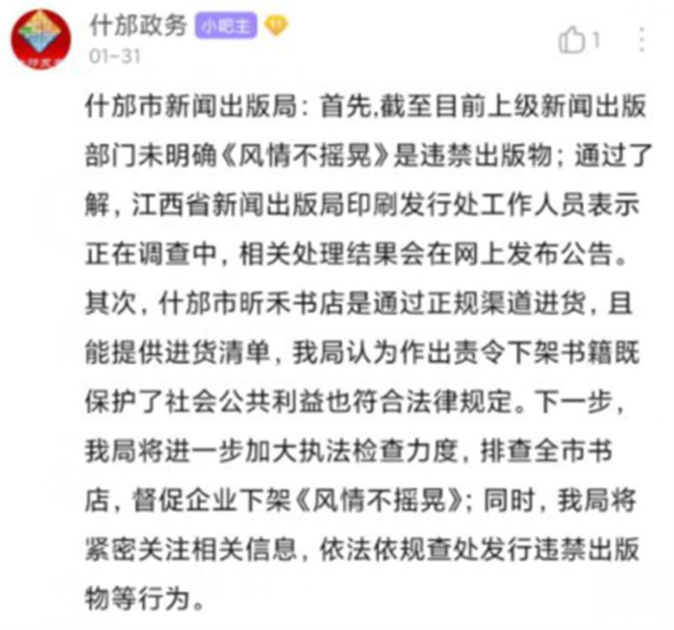 1月31日,什邡市新闻出版局发布更为详细回复表示,首先,截至目前上级新闻出版部门未明确《风情不摇晃》是违禁出版物;通过了解,江西省新闻出版局印刷发行处工作人员表示正在调查中,相关处理结果会在网上发布公告。其次,什邡市昕禾书店是通过正规渠道进货,且能提供进货清单,该局认为作出责令下架书籍既保护了社会公共利益也符合法律规定。下一步,该局将进一步加大执法检查力度,排查全市书店,督促企业下架《风情不摇晃》;同时,该局将紧密关注相关信息,依法依规查处发行违禁出版物等行为。