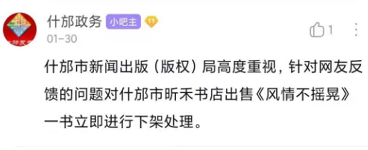 1月30日,“什邡政务”回复网友称:什邡市新闻出版(版权)局高度重视,针对网友反馈的问题对什邡市昕禾书店出售《风情不摇晃》一书立即进行下架处理。