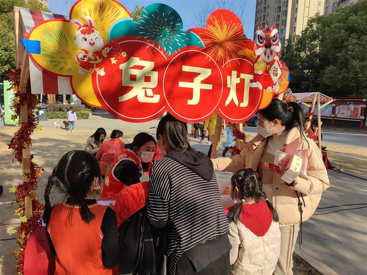另一旁,闯关游戏激烈地进行着——投壶、射箭、套圈等,让居民们感受着充满文化气息的节日氛围。通过游戏互动,居民们兴高采烈地到非遗民俗区领取喜爱的奖品——糖葫芦或糖画。在非遗民俗区,手工制作兔子花灯吸引了许多心灵手巧的居民和小朋友。正值兔年,一只只粉色的萌兔花灯在老师的手里活灵活现、栩栩如生。