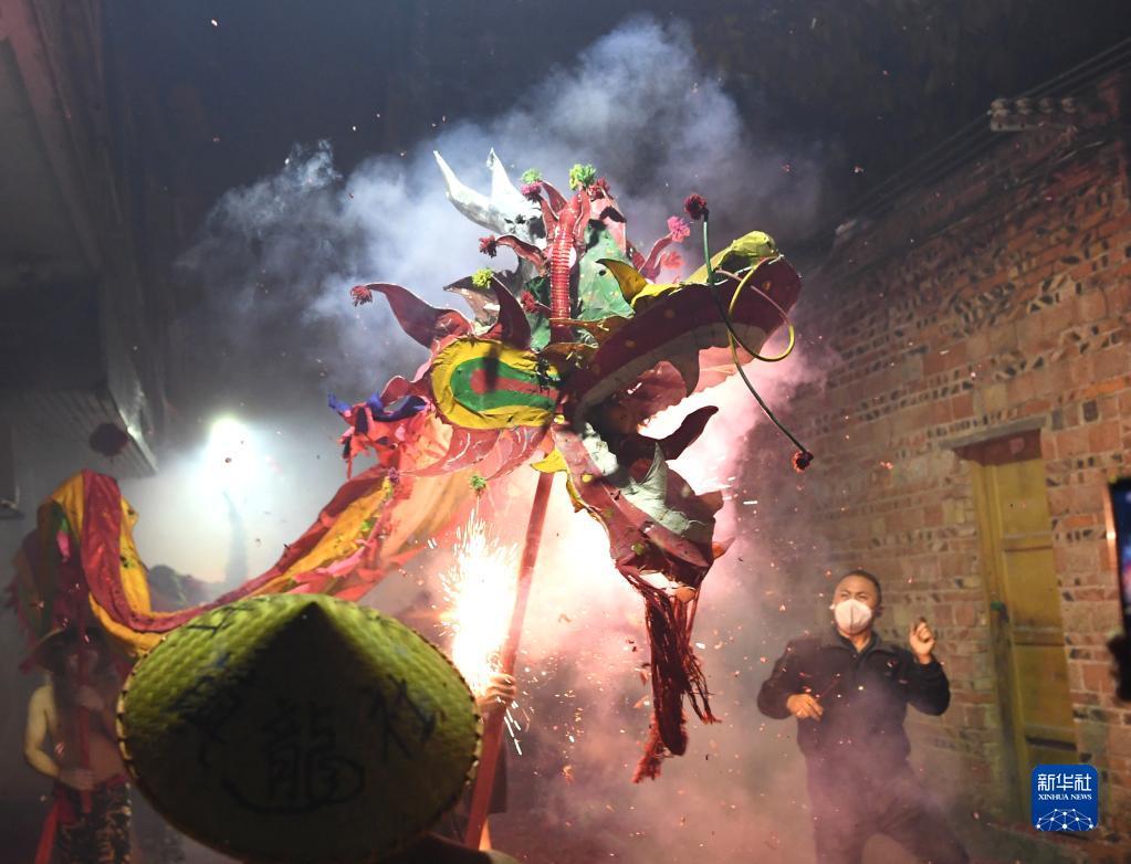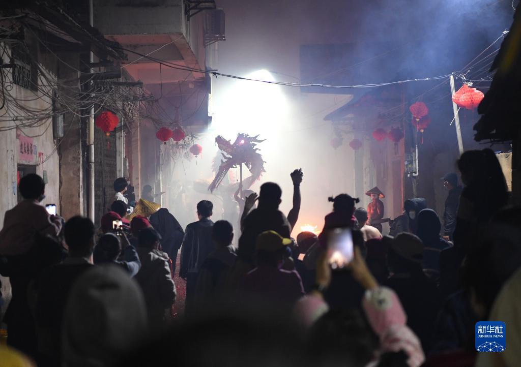 人们在广西南宁市宾阳县县城舞炮龙(2月1日摄)。