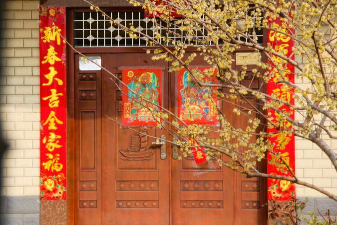 白合村,一农家腊梅在红红对联的映照衬托下,开得那么美丽,如诗如画。金黄的梅花,红红的春联,对联上金黄的喜字,红红的灯笼,庭院还有鸟儿觅食鸣唱,狗狗“汪汪”,昭示兔年旺旺。这农家小院,一幅幅画,一树梅花,喜气洋洋,红红火火,让人陶醉。