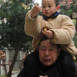 城区校园,几株腊梅先后开放,有的早些时已经盛开,有的当下正盛。古色古香的凉亭,新人心脾的梅花, 装扮着春天的小区。小朋友想闻闻梅花的香味,够不着。爷爷当人梯子,背着小朋友闻香,场面温馨幸福。